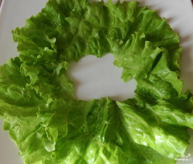 Салат хорошо вымойте. Удалите жёсткие стебли и хорошо просушите листья. Выложите часть салата кругом на тарелку, сформировав таким образом подложку для подачи блюда.
