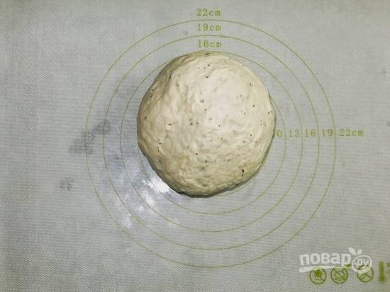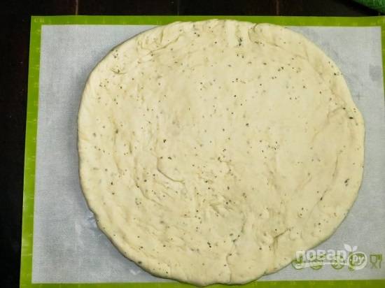 Раскатываем тесто в круглую лепешку толщиной чуть меньше 1 см.