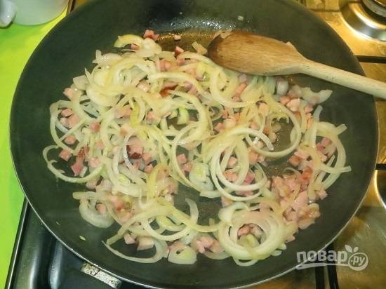 Мелко нарежем бекон, обжарим его вместе с измельченным луком.