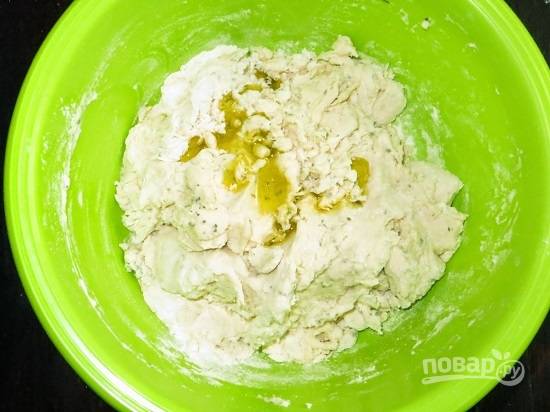 В миску просеиваем оставшуюся муку, добавляем соль, пол чайной ложки сушеного базилика и растительное масло.