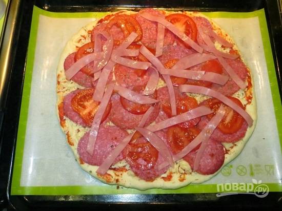 И выкладываем салями, помидоры, ветчину.