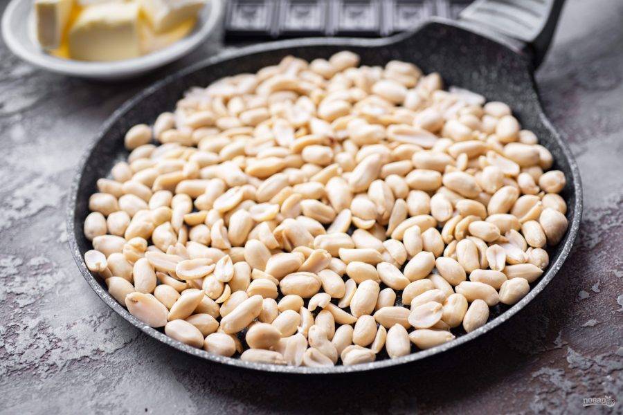 Параллельно выложите весь арахис в сухую сковороду и на небольшом огне обжарьте до легкого золотистого оттенка.