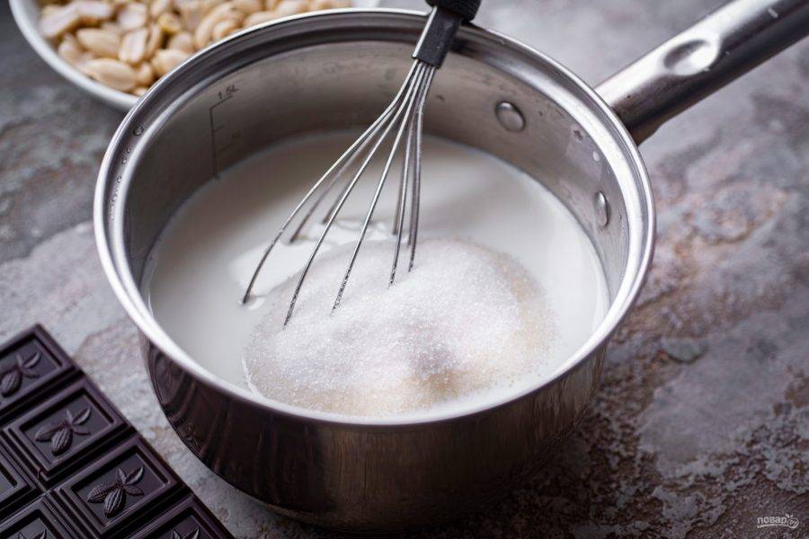 В сотейник с толстым дном влейте молоко и добавьте весь сахар. Поставьте сотейник на небольшой огонь и, помешивая венчиком, дождитесь закипания.
