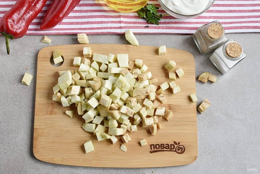 Баклажаны очистите от кожицы и нарежьте некрупными кубиками.