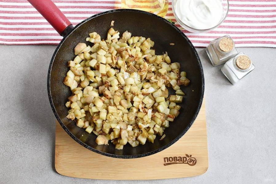 Выложите баклажаны в сковороду к луку. Жарьте 3 минуты, помешивая.
