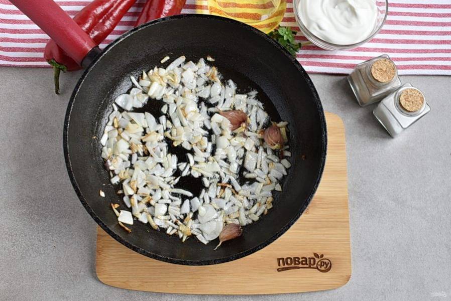 Разогрейте масло и выложите лук и чеснок. Жарьте, помешивая, до легкой позолоты. Посолите слегка. Извлеките чеснок.