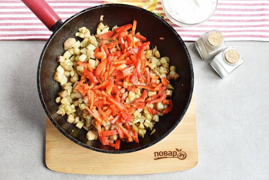 Добавьте тонко нашинкованный сладкий перец и жарьте до мягкости баклажанов, еще минуты 3-4.
