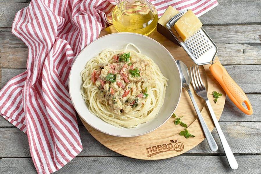 Разложите макароны по тарелкам и щедро полейте соусом. При желании и наличии присыпьте блюдо сверху тертым пармезаном, украсьте листочками базилика и сразу подавайте к столу.
