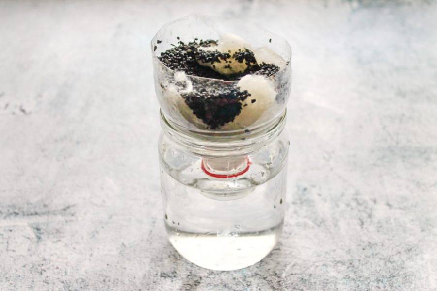 У пластиковой бутылки отрежьте часть с горлышком, снимите крышку и установите на банку горлышком вниз. В импровизированную воронку выложите слой ваты, а на нее кокосовый уголь, который предварительно сполоснули. Тонкой струйкой вливайте самогон на кокосовый уголь, фильтруя его. Разлейте водку по бутылкам, закройте и дайте постоять в прохладном месте 7 дней.