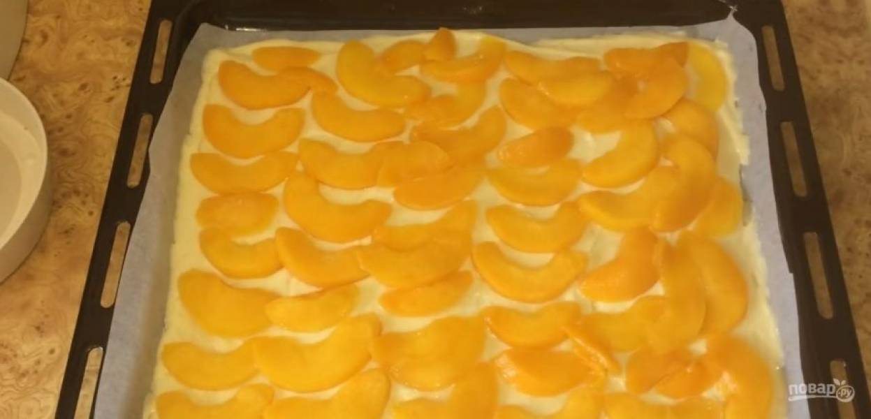 1. Сахар смешайте со сливочным маслом, нарезанным кубиками, и мукой. Разотрите массу до состояния крошки. Консервированные персики выньте из банки и нарежьте на тонкие пластинки.