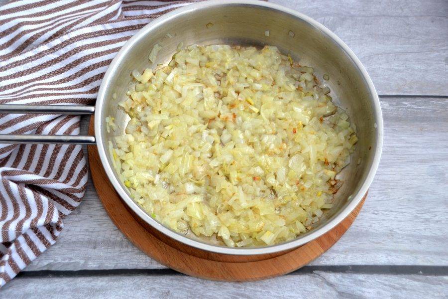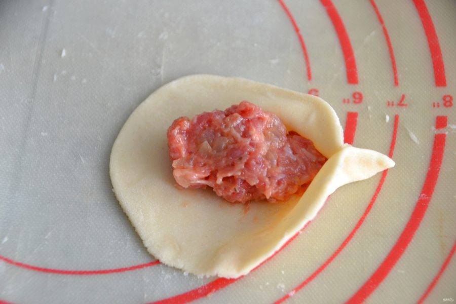 Пока тесто "отдыхает", займитесь приготовлением фарша. Фарш желательно перекрутить через мясорубку дважды. Мелко нарежьте лук и обжарьте на сковороде на растительном масле.