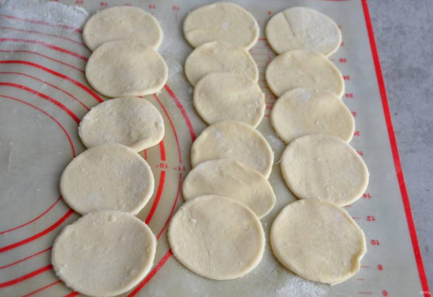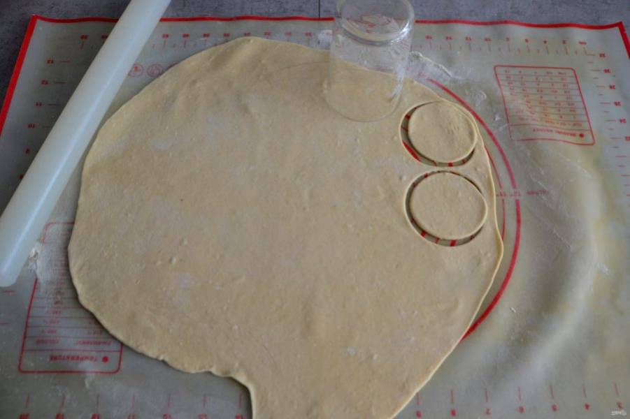 Вторую половину теста раскатайте в тонкий пласт толщиной около 2 мм. Вырежьте кружочки из теста формочкой для печенья или тонким стаканом.