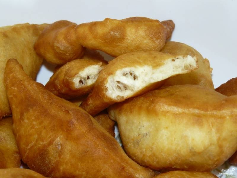 Добавьте вашу любимую начинку и налепите пирожков. Обжаривайте их до золотистого цвета на сковороде в приличном количестве масла.