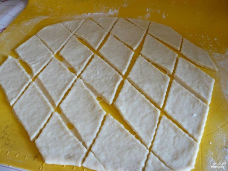 Затем тесто раскатайте. Раскатываем потоньше, чтобы пирожки смогли хорошо прожариться и внутри.