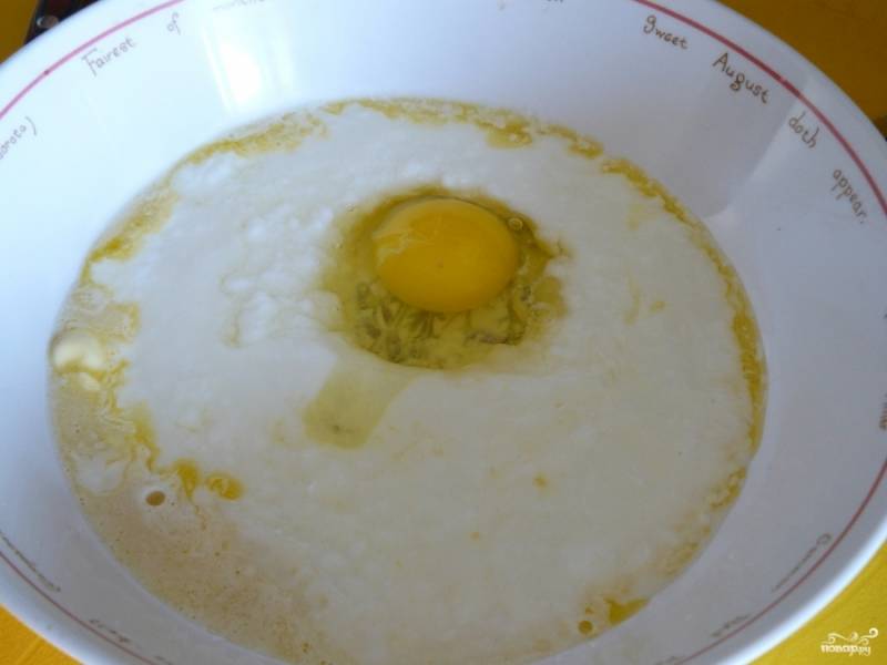 Итак, сначала разбейте яйцо, добавьте в него соду и кефир. Соду гасить не надо. Потом добавьте муку.