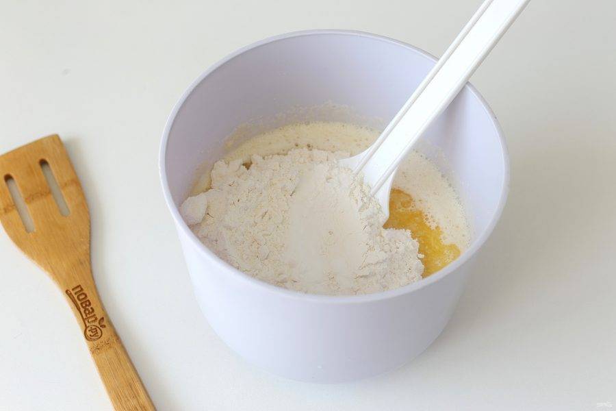 Перемешайте. Добавьте муку и соду.