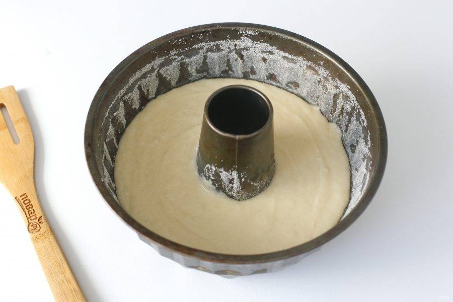 Перелейте тесто в смазанную маслом форму до запекания. Дно и бока предварительно обсыпьте мукой или манкой. Выпекайте в духовке при температуре 180 градусов около 40 минут.