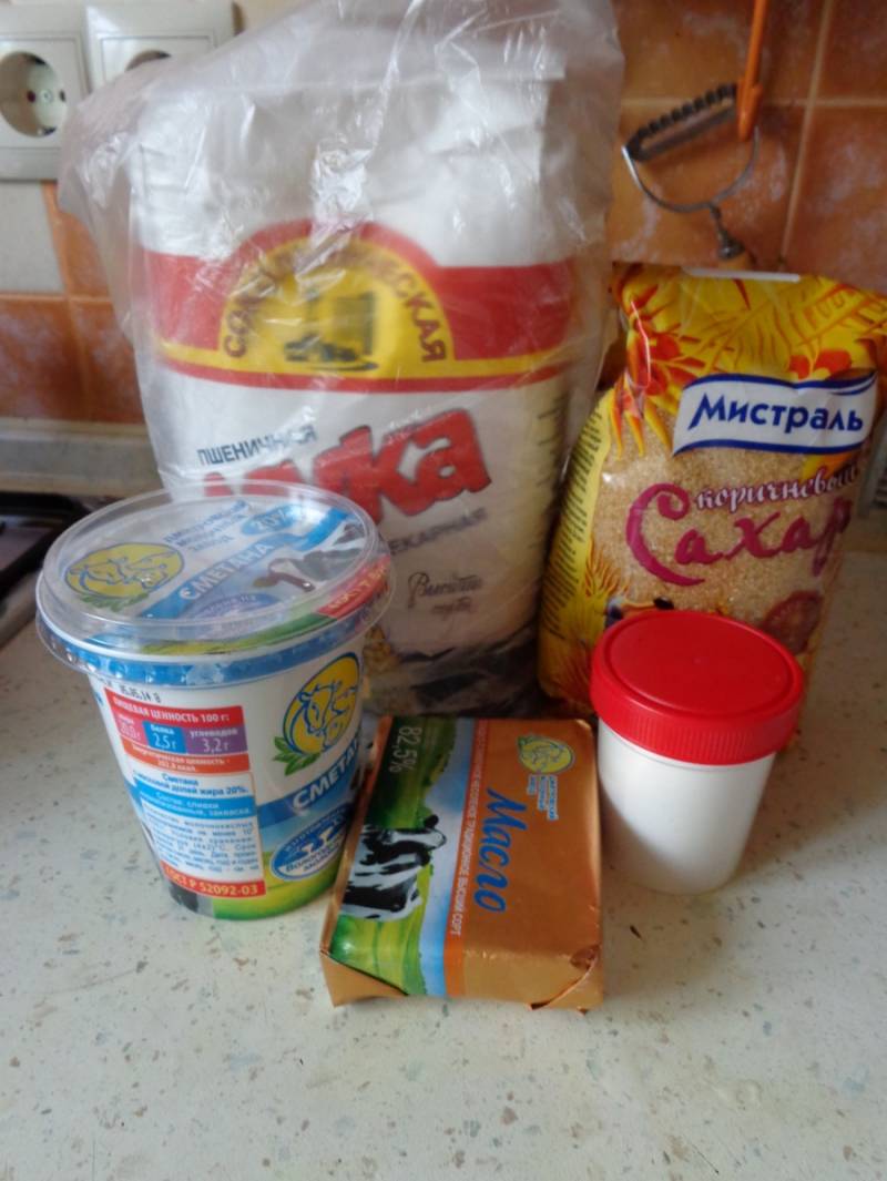 делаем песочное тесто-как обычно- топим масло, добавляем сахар(1 стакан), мешаем, пока не растворится, потом добавляем туда сметану, снова мешаем, добавляем погашенную уксусом соду, перемешиваем и всыпаем частями просеянную муку. Месим тесто, пока не получится туго- эластичная масса и убираем его в холодильник))