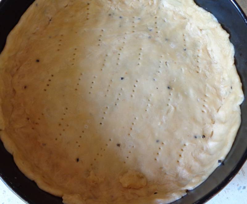 тесто достаем и раскатываем его в пласт-лепешку толщиной до 1 см. Берем форму для выпекания(круглую и большую) и выкладываем круг из теста туда, формируем бортики- это наша основа) протыкаем вилочкой, чтоб не вздулось- и в духовку 180 градусов на 20-зо минут)))