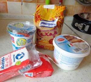 пока тесто "мерзнет",делаем начинку-творог смешиваем со сметаной и оставшимся сахаром