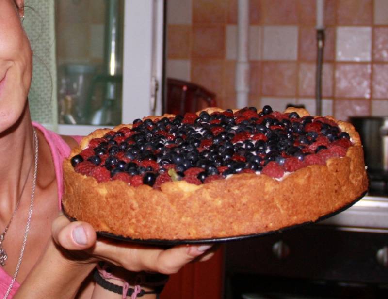 когда основа готова-достаем ее из духовки и даем полностью остыть. Затем выкладываем творожную начинку, сверху-ягоды и убираем торт в холодильник на ночь))) а утром наслаждаемся превосходным кофе с превосходным ТОРТОМ)))))