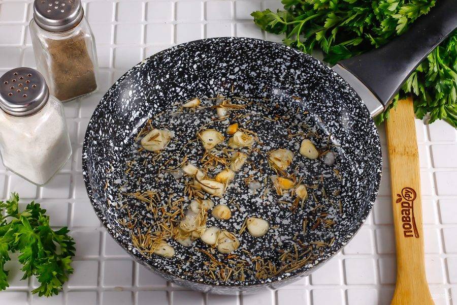В это время очистите чесночные зубчики и промойте в воде. Нарежьте слайсами и прогрейте в растительном масле вместе с сушеным розмарином или тимьяном практически до кипения.