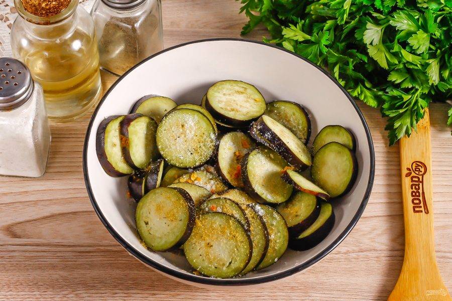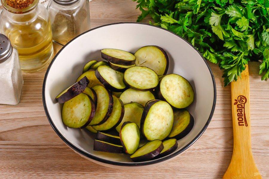 Промойте баклажаны в воде, срежьте хвостики с овощей и нарежьте их кружочками не толще 1 см. Выложите нарезку в глубокую емкость.