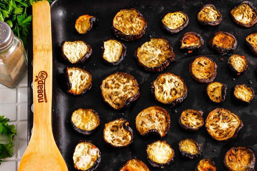Выложите баклажанную нарезку на противень и поместите его в духовку, разогретую до 100 градусов. Дверцу техники оставьте слегка приоткрытой и томите примерно 1-2 часа.