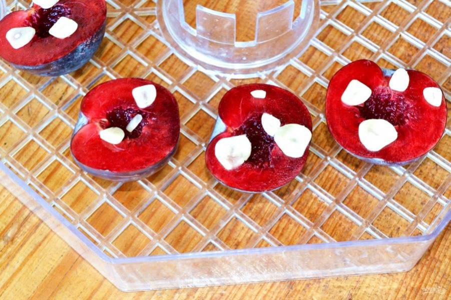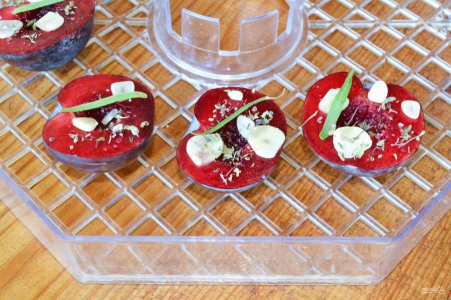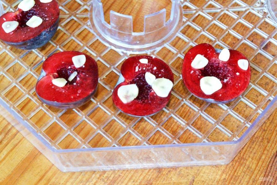 Выложите на решетку сушилки или противень сливы и присыпьте нарезанным тонкими пластинками чесноком.