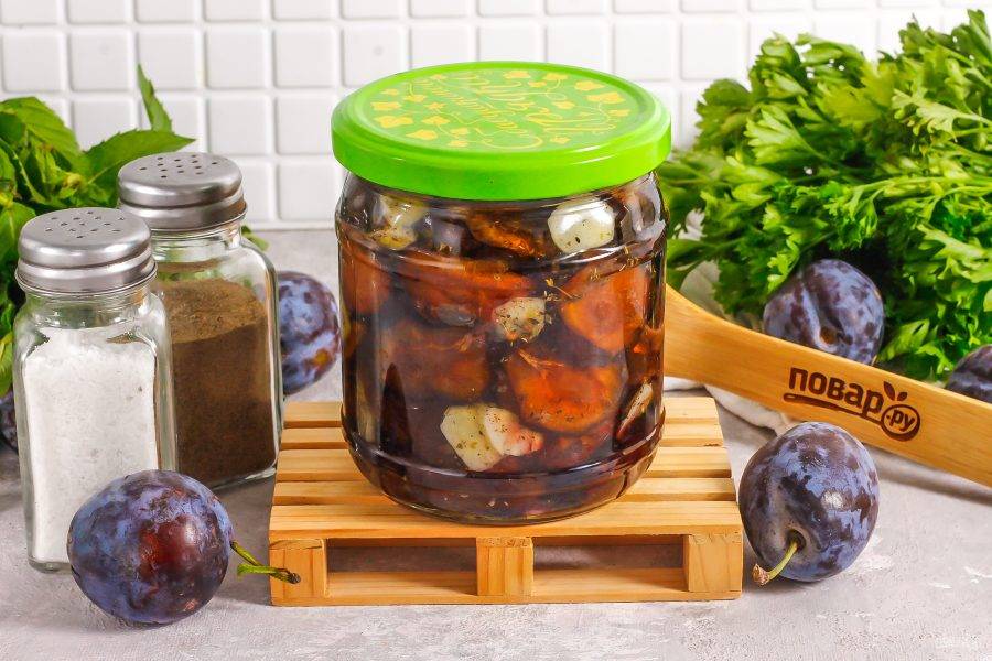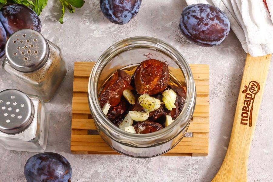 Ошпарьте банку кипятком, выложите в нее первым слоем горячие вяленые сливы. Влейте пару столовых ложек ароматного масла с чесноком и приправами.