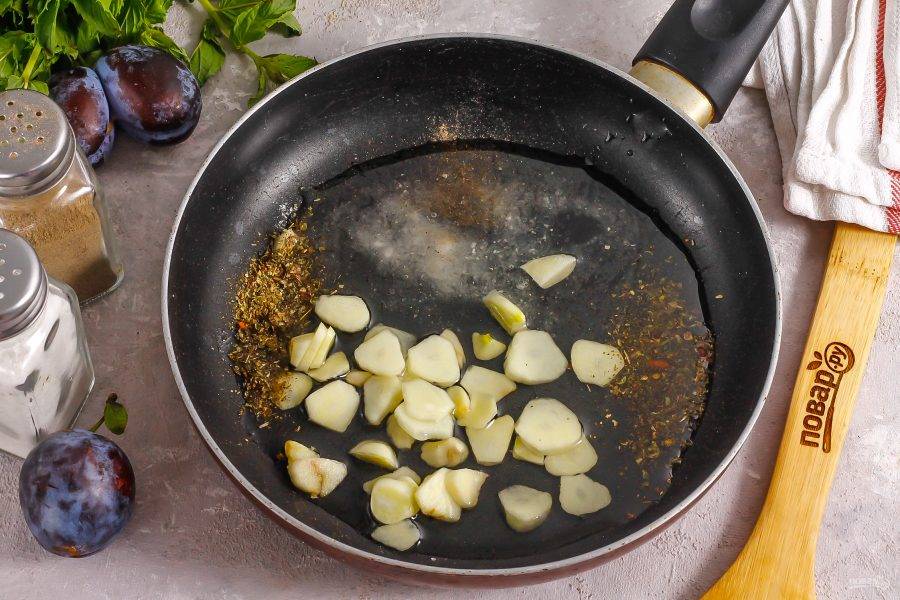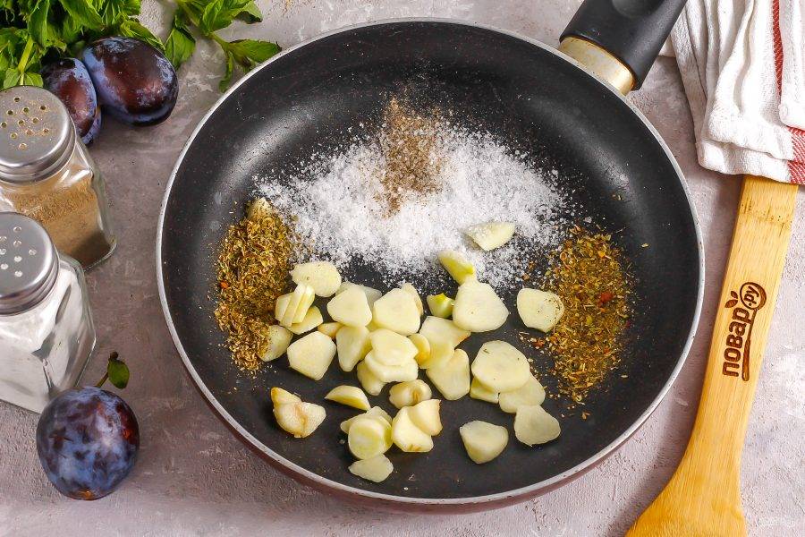 Чеснок очистите от шелухи, промойте в воде. Нарежьте слайсами. Выложите на сковороду, всыпьте соль, молотый черный перец и итальянские травы.