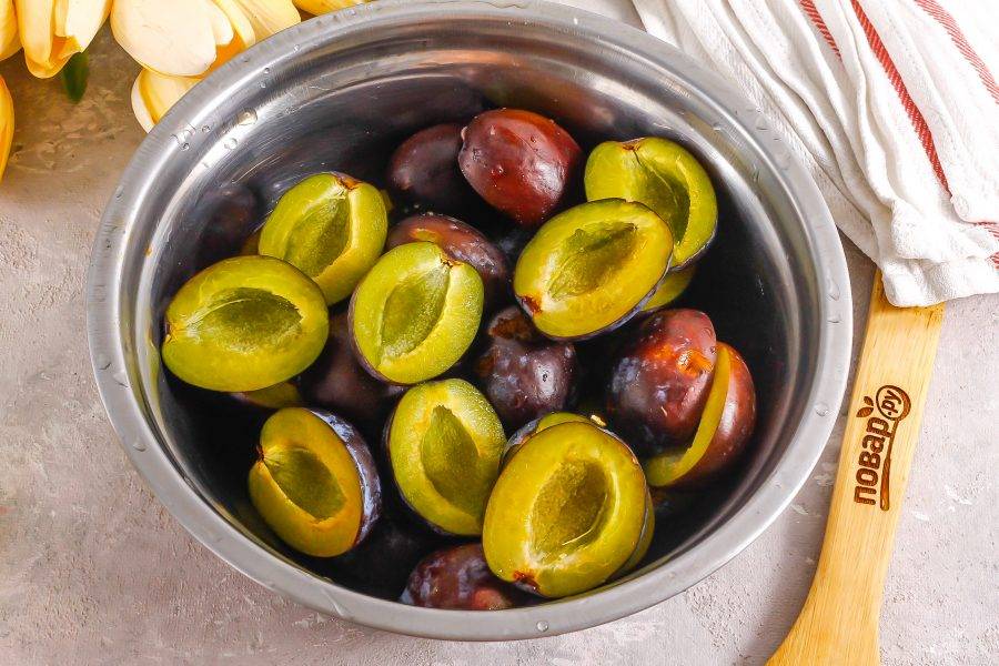 Сливы промойте в воде, удалите хвостики. Разрежьте каждый плод и удалите из него косточки.