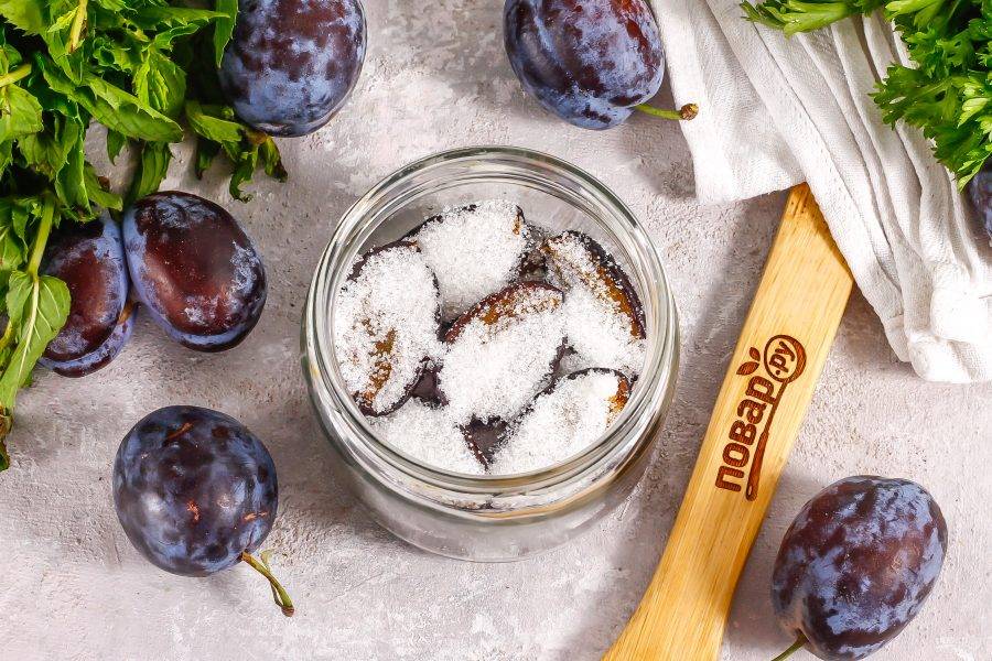 Затем снова сливы, и снова сахар, заполняя емкость до верха. Закрутите горячей крышкой банку по резьбе или с помощью ключа для консервации. Остудите и перенесите в кладовую.