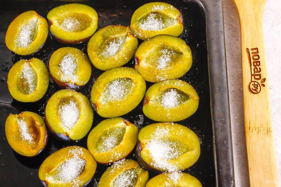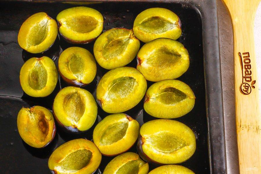 Смажьте растительным маслом противень, чтобы вяленые сливы можно было легко снять. Выложите половинки слив.