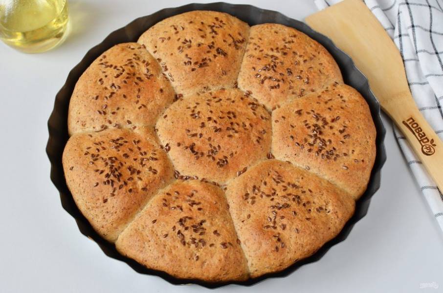 Снимите осторожно пищевую пленку. Смажьте мучном смесью булочки и посыпьте 2 ст.л. льна.