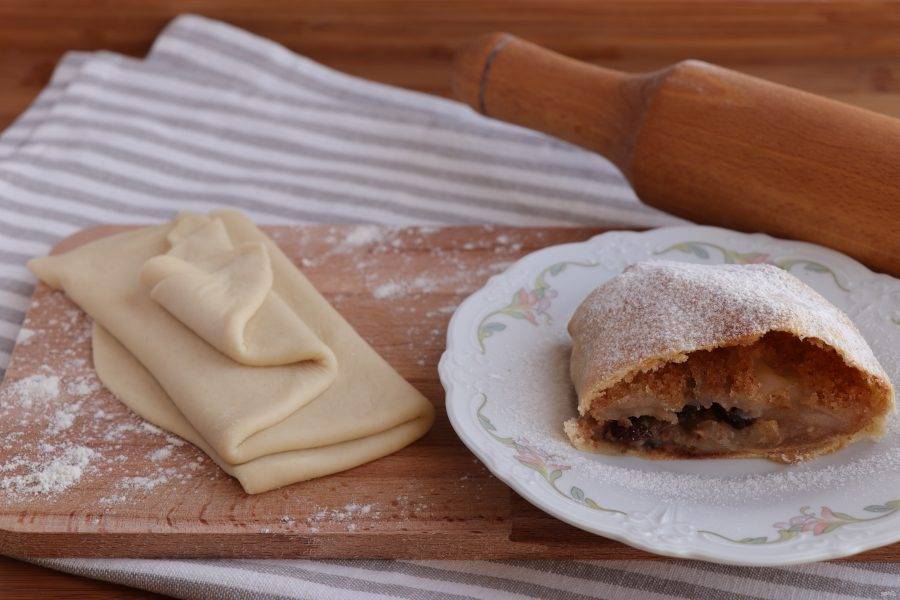 Через час с тестом можно работать. Обычно я делю его на две равные части и выпекаю два штруделя. Тесто нужно сначала тонко раскатать при помощи скалки.