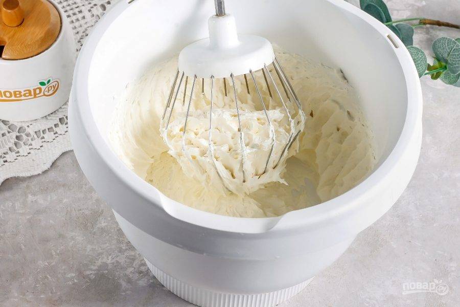 Затем взбейте массу в чаше кухонного комбайна или миксера примерно 3-4 минуты. Она легко взбивается и сразу превращается в пышный крем. Имейте в виду, что работать с ганашом нужно сразу же после взбивания, иначе за 5-7 минут он опять начинает твердеть.