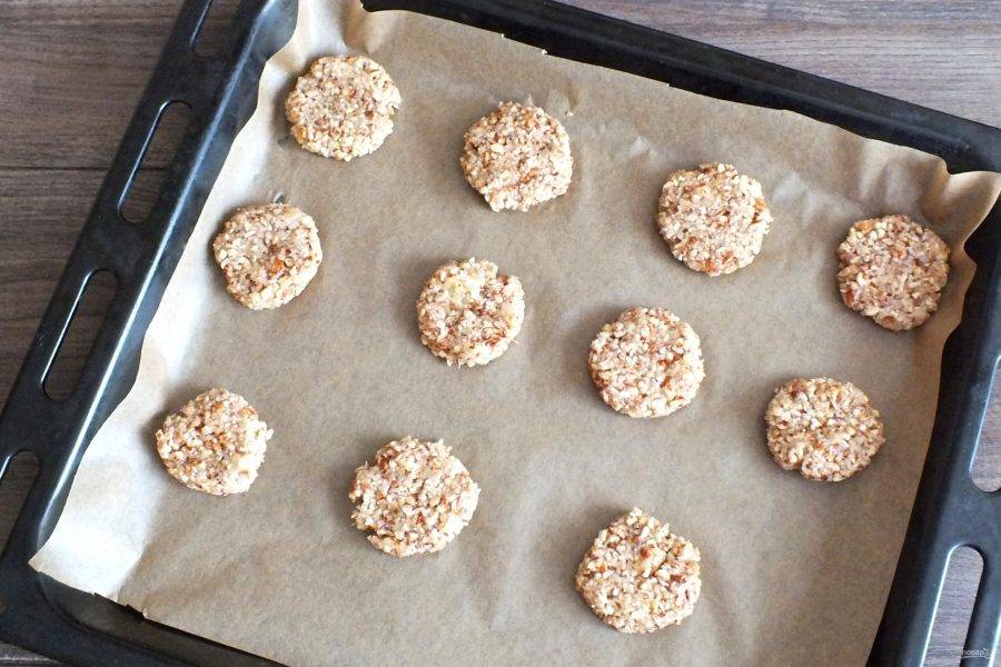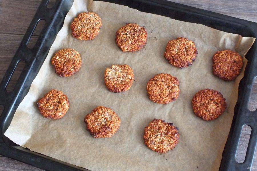 По истечении времени возьмите противень и застелите его пекарской бумагой. Достаньте чашу с тестом из холодильника. Отщипните кусочек теста, размером с грецкий орех. Хорошо его разомните и скатайте плотный шарик. Разомните его в лепешечку, выложите заготовку на противень. Подготовленное печенье поставьте в разогретую до 170 градусов духовку на 10-15 минут. Через указанное время, печенье зарумянится. Температуру убавьте до 120 градусов и продолжайте печь еще 10-12 минут. После выключите духовку.