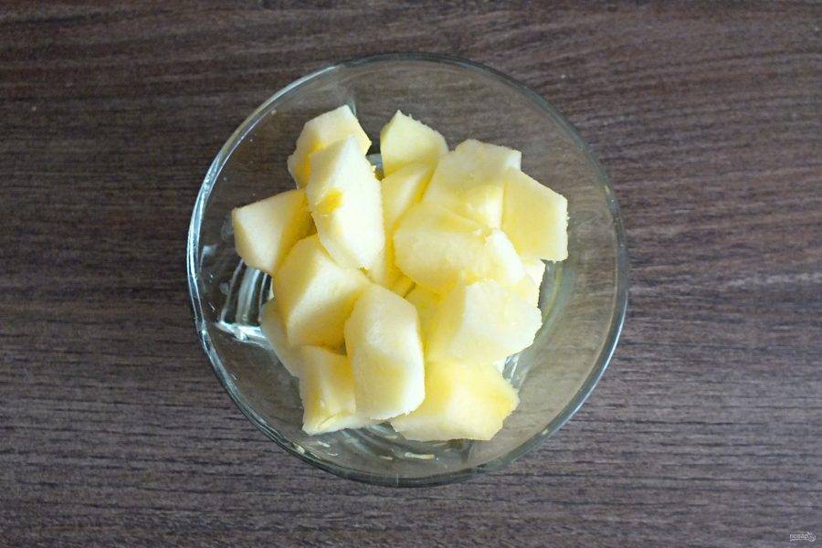 Яблоки почистите и удалите семенную коробочку. Одно яблоко порежьте на небольшие кусочки. Поставьте в микроволновую печь на максимальную мощность. Распаривайте яблоки в течение 5 минут. После разомните в пюре.