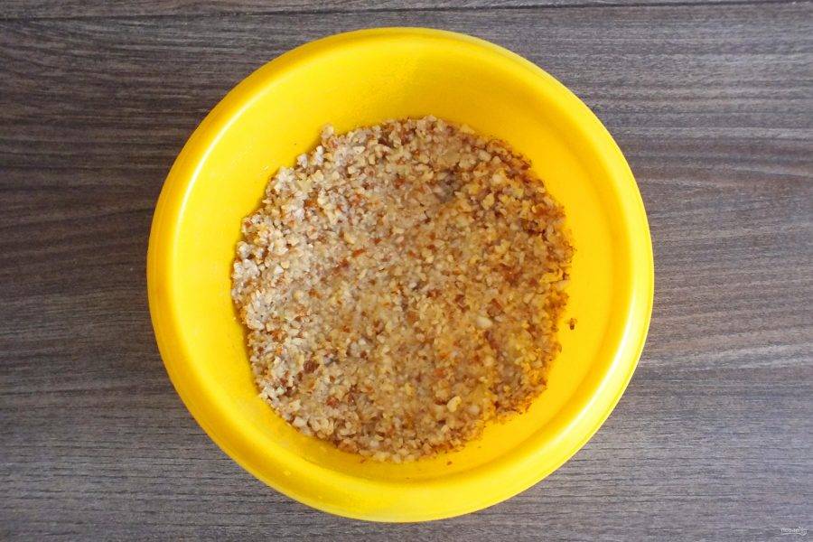 Массу хорошо перемешайте. Утрамбуйте и уберите в холодильник на 20-30 минут.