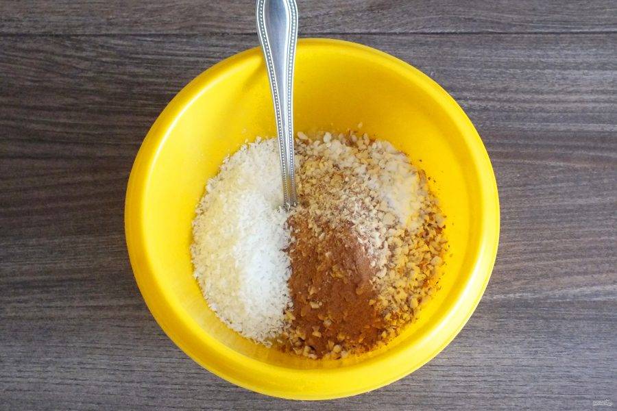 Добавьте к яблочно-медовой массе измельченный миндаль, кокосовую стружку, соду, корицу.