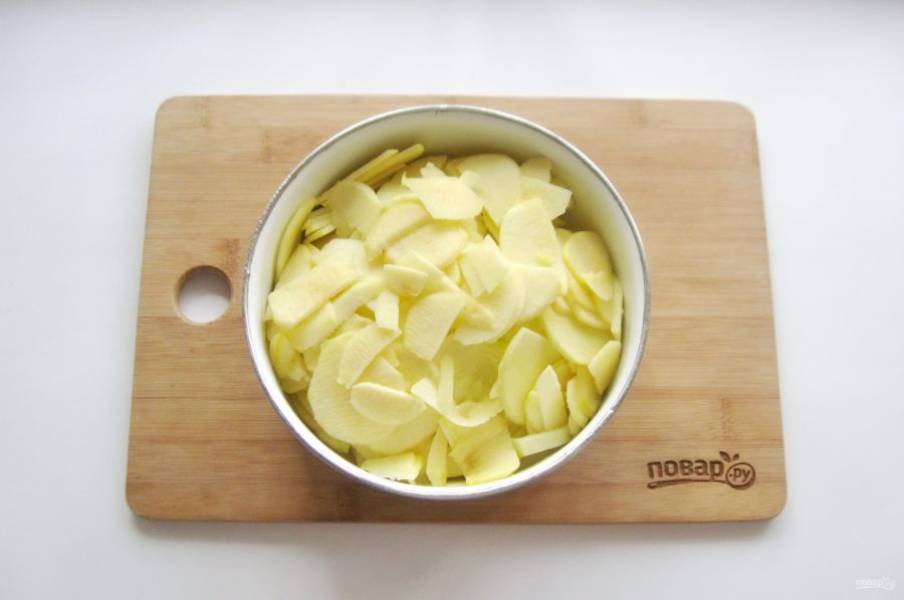 Удалите у яблок сердцевину и нарежьте тонкими пластинками.