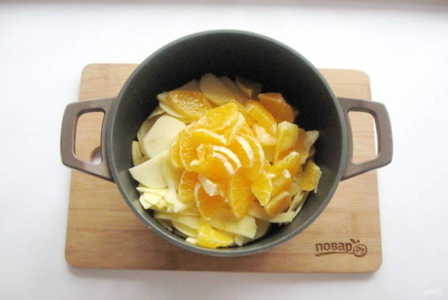 Влейте 50 мл. воды и тушите апельсин с яблоками до мягкости. Много воды наливать не стоит: фрукты пустят много сока.
