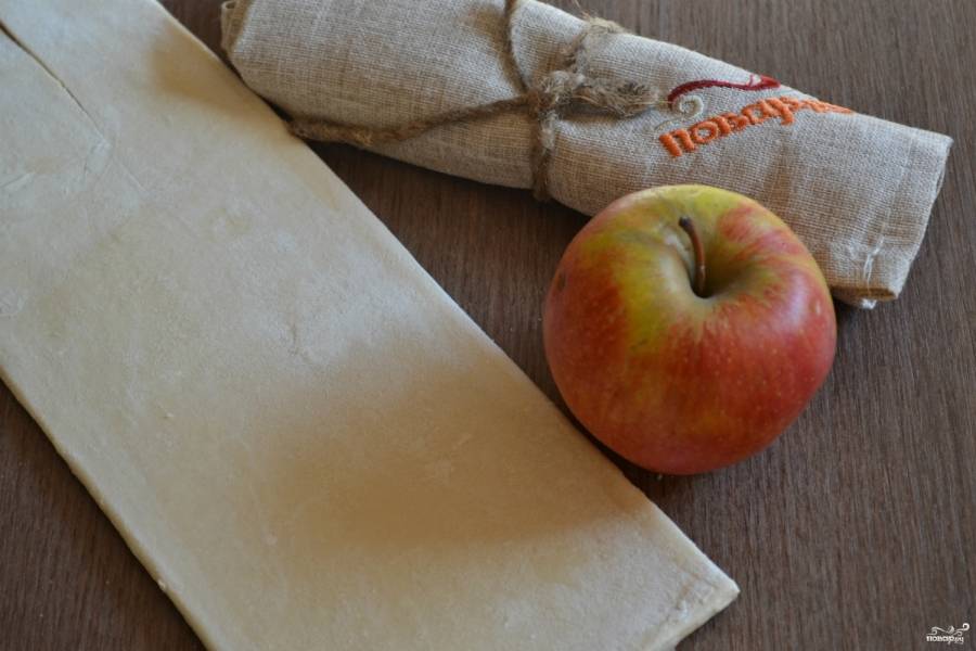 Слоеное тесто порежьте на полоски шириной 3 см. Выложите яблочные дольки на тесто, как показано на фото.