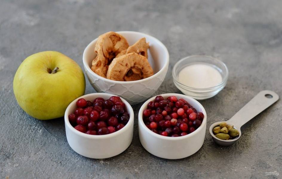 Выложите в чайник бруснику и клюкву, сушеные и свежие нарезанные яблоки, добавьте кардамон и сахар.