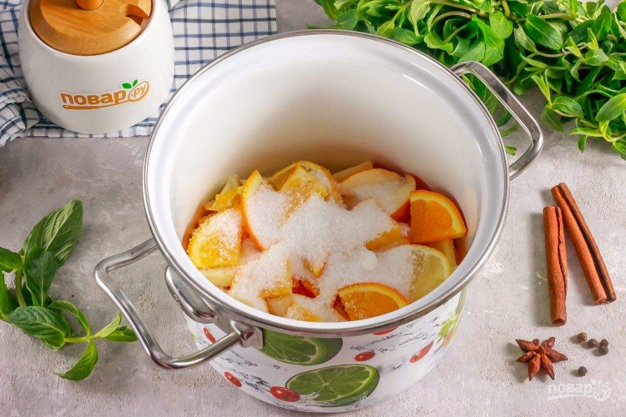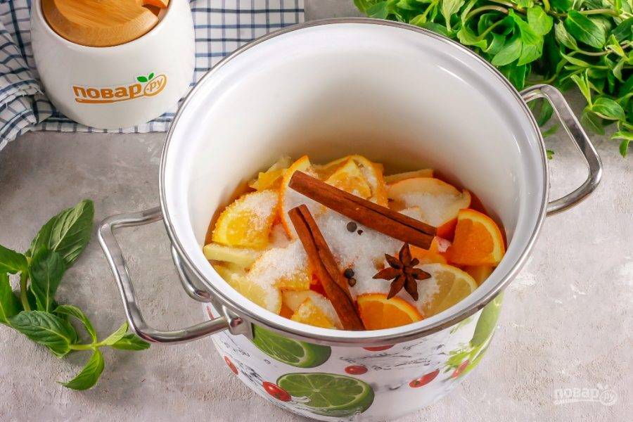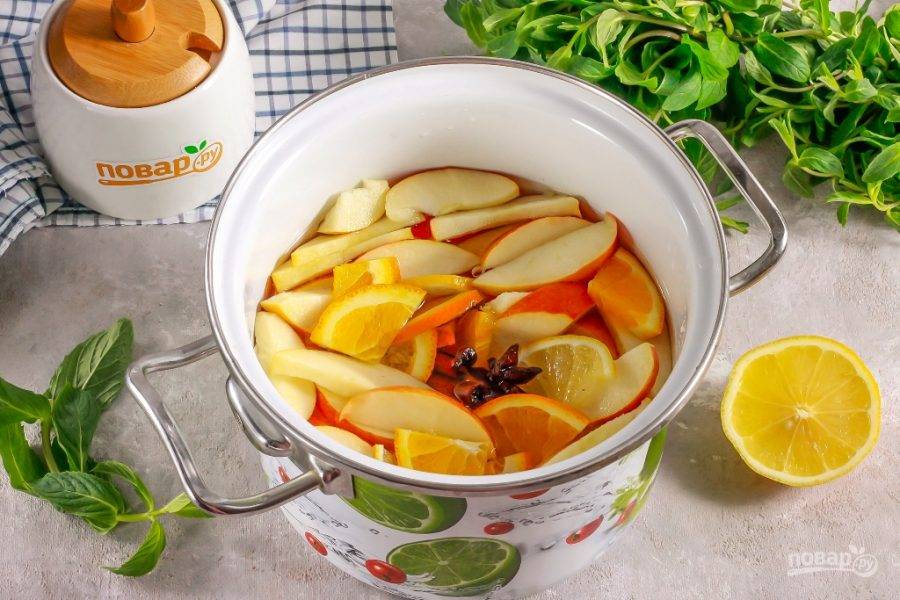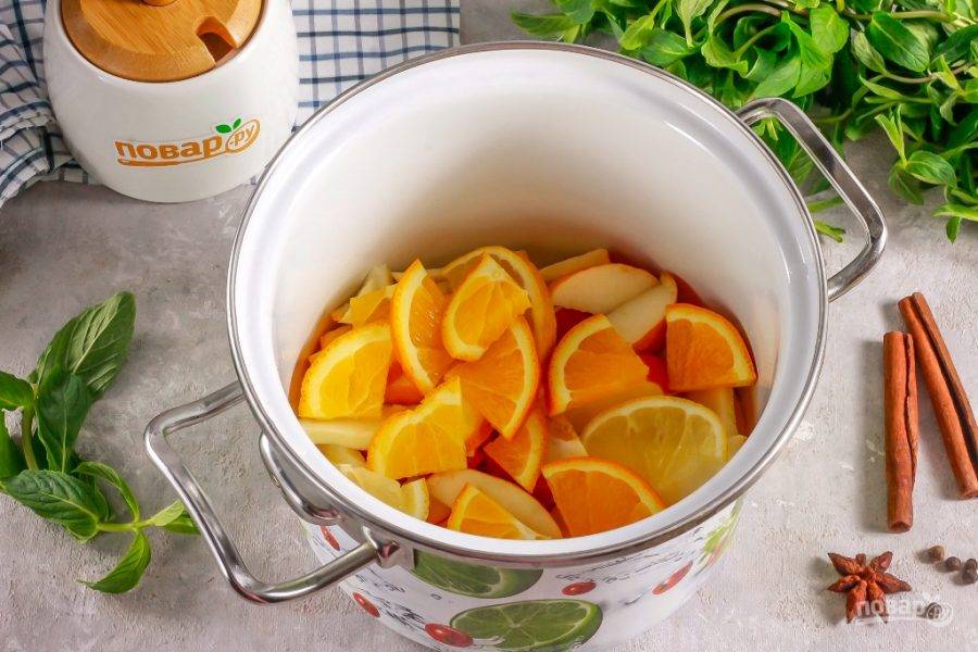 Обдайте и апельсин кипятком, чтобы эфирные масла в кожуре не выделили горечь. Нарежьте его ломтиками и добавьте к остальным фруктовым нарезкам в кастрюлю. Желательно удалить косточки из фрукта, если они имеются в нем.