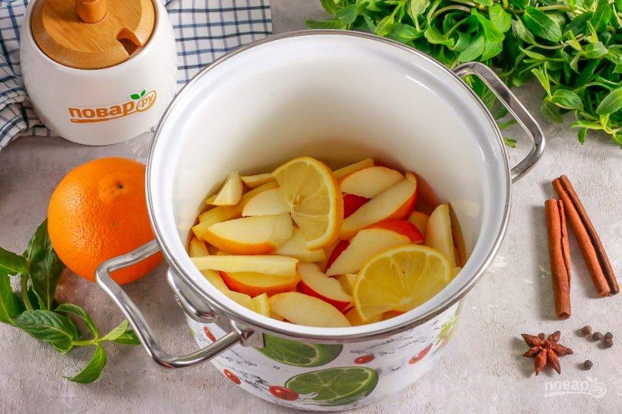 Яблоки промойте в воде, разрежьте на четыре части и срежьте семенные блоки. Нарежьте четвертинки ломтиками и высыпьте их в кастрюлю или ковш. Обдайте четверть лимона кипятком и нарежьте ломтиками. Добавьте в емкость к яблочной нарезке.