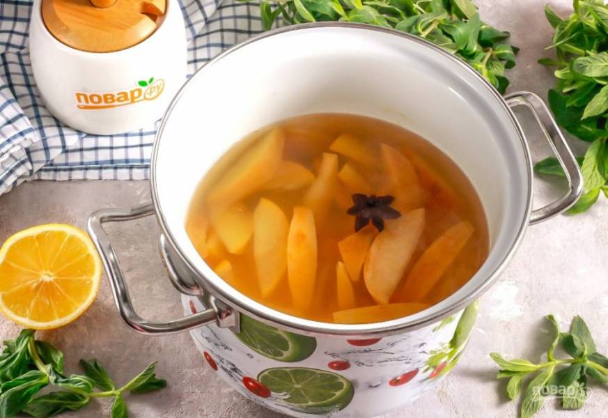 Влейте теплую воду и поместите емкость на плиту. Отварите примерно 5-8 минут, чтобы нарезки отдали свой вкус, цвет и аромат жидкости.