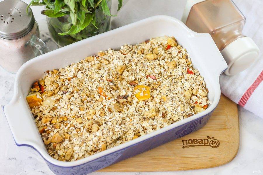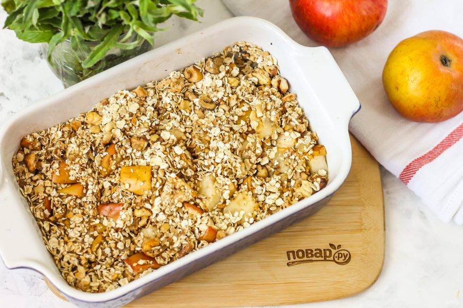 Выложите сухую смесь на яблочный слой, разровняйте. Разогрейте духовку до 200 градусов и поместите в нее форму, если она металлическая. Если фарфоровая или стеклянная, то поместите форму в холодную духовку, иначе она лопнет от перепада температур.