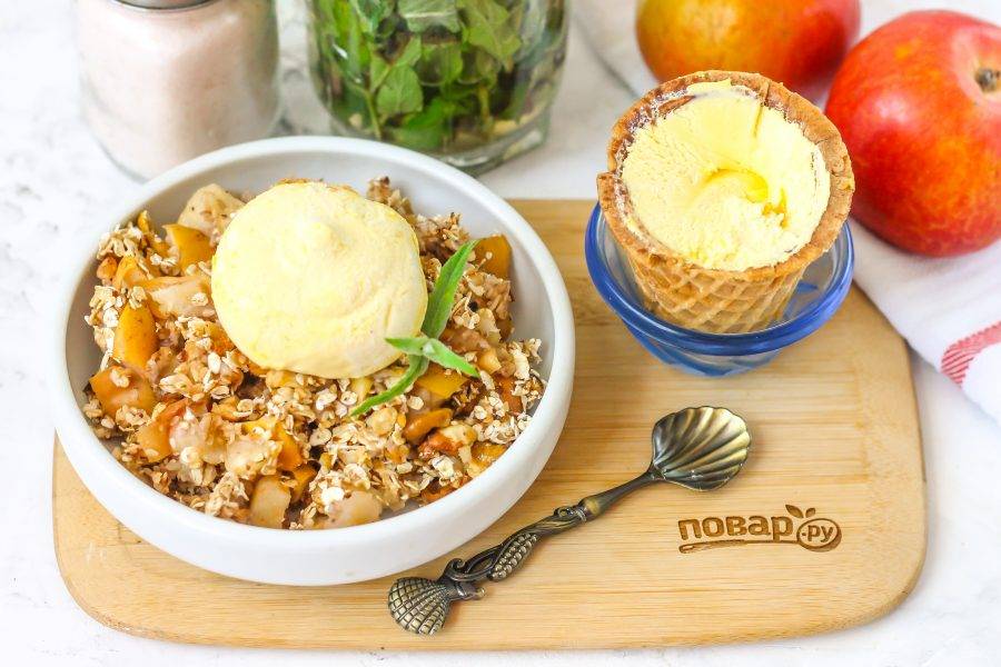Выложите крамбл в тарелки или пиалы, подайте к столу с мороженым и напитками.